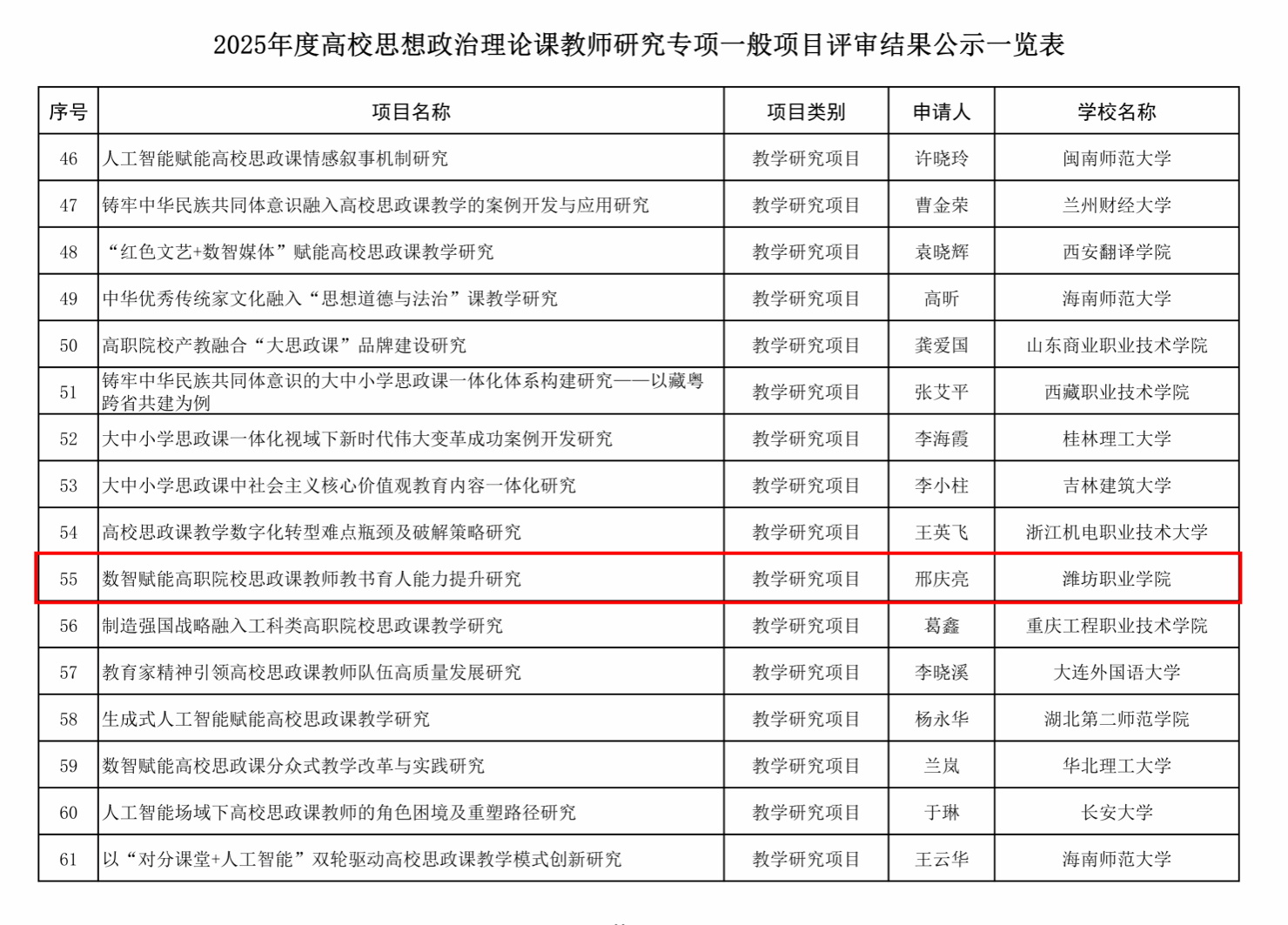 教育部高校思想政治理论课教师研究专项项目,旨在汇聚全国优秀思政课教师力量,围绕思政课建设中的关键问题与前沿课题开展有组织科研,为推进思政课改革创新、提升育人实效提供有力支撑。马克思主义学院邢庆亮团队申请的课题《数智赋能高职院校思政课教师教书育人能力提升研究》入选拟立项名单。该课题应对新时代对思政课建设的要求,致力于破解数智化背景下高职院校思政课教师能力提升的现实难题,研究将通过构建思政课教师教书育人能力模型,建设“双融”课程资源库,探讨思政课教师教书育人能力标准,探索提升思政课教师教书育人能力主要策略,为高职院校强化思政课教师队伍专业化建设、切实提升思政教育育人实效提供重要理论支撑与实践指引。