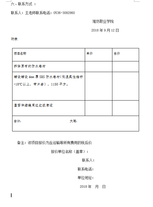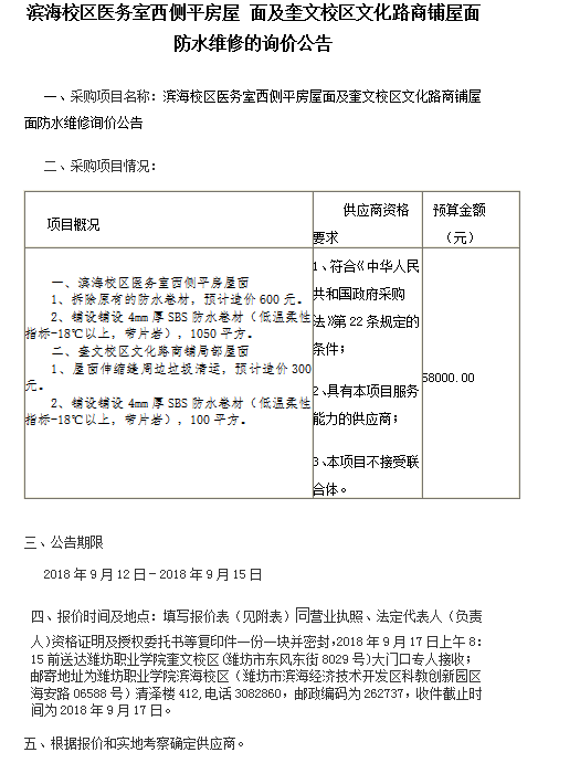 滨海校区医务室西侧平房屋面及奎文校区文化路商铺屋面防水维修的询价公告